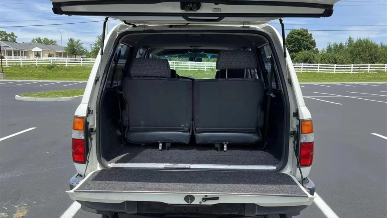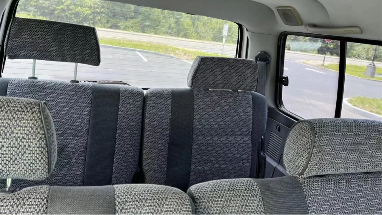 The cabin is cavernous, boasting three rows of seating for seven occupants. Features include air conditioning, power steering, power windows, power door locks, and Kenwood AM/FM/CD audio system. The tailgate has a clever split-folding design which allows for easy cargo loading out back.