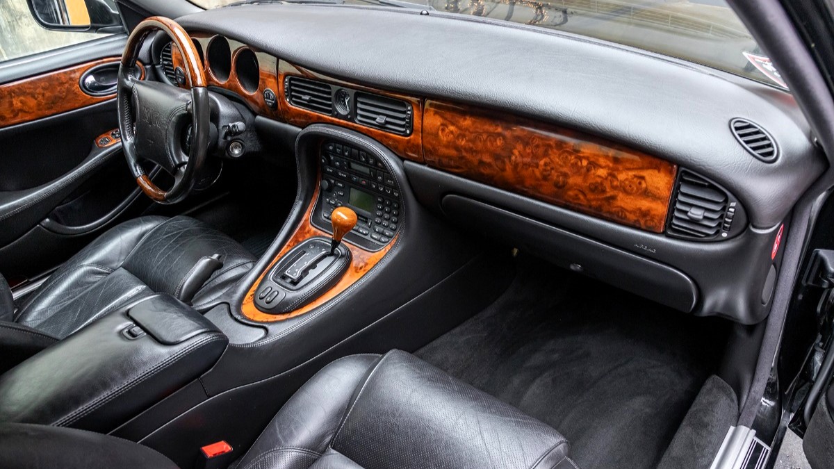 More than a quarter century after it left Jaguar’s factory, this 2000 XJR still looks dashing with its mesh grille inserts, “leaper” hood ornament, and sporty 18-inch “Asteroid” wheels. I usually find that dark paint obscures a lot of a car’s lines, but the Anthracite Metallic here gives the XJR a sleek, sinister appearance that a powder blue or British Racing Green can’t match.