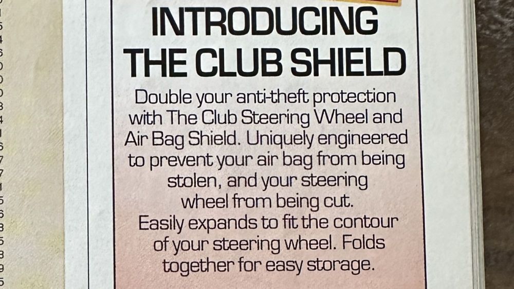 All of this is to segue into something interesting I recently came across in a magazine. It was an advertisement for a contraption produced by the same manufacturer as The Club (a steering wheel lock that prevented the wheel from turning) that was designed to prevent airbag theft. See for yourself!